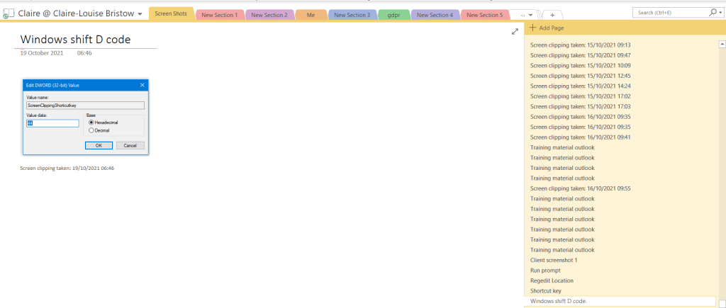 If you have used OneNote for screen capture, (which in my opinion is the best way to take a screenshot) you will already know the pain when the short cut key stops working! I re-programmed mine, all was good, and then I got a new computer. So, I had to go through the pain of working out how to get the short cut key back again.