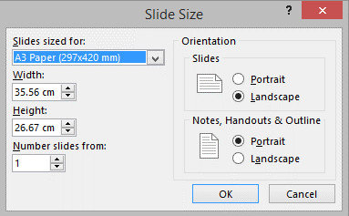 - Navigate to the ‘Design’ tab in the Ribbon at the top. From here, you should be able to see a button called ‘Slide Size’. (I’ve chosen A3, but select either this or A4 depending on the size of your printer).