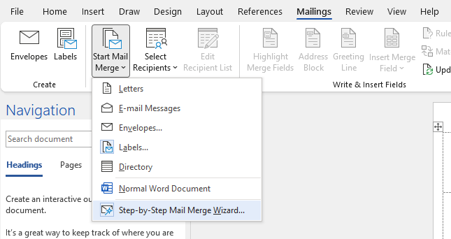 - With a new document in Word open, click ‘Mailings’ - ‘Start Mail Merge’ - then, ‘Step-by-Step Mail Merge’.