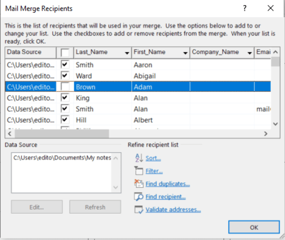 - Select (and un-select) any contacts you do not wish to include in the final mail merge. You can always come back and edit this list.